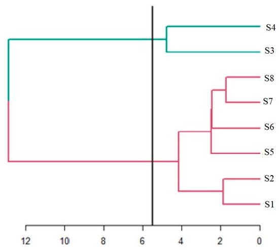Cluster analyses: S1–S8—station, mixing zone (marked green), and an urban area (marked violet); axis “x”—Euclidean measure.