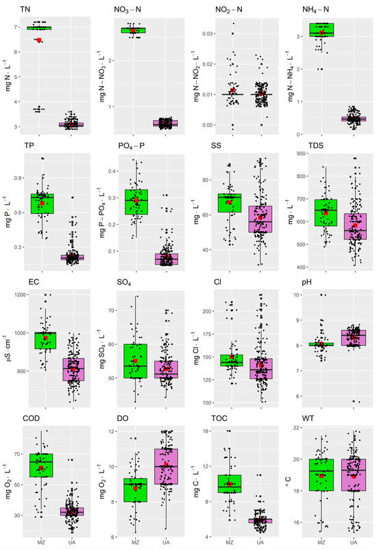 The results of water quality tests at eight stations located on the river path are presented in Table 3. As a result of statistical analysis, statistically significant differences (Friedmann test, α = 0.05) between stations S3 and S4 and the remaining stations were found. A statistically significant increase in pollution was found in the case of TN, N-NO3−, N-NH4+, TP, P-PO43+, SS, EC, COD, and TOC. Since statistically significant value differences concerned 9 of the 16 analyzed parameters, the authors performed cluster analysis using the Ward method. The results of the classification are presented graphically in the form of a dendrogram (Figure 3). Based on the similarity measure between the analyzed parameters on the dendrogram, a mixing zone (marked green) and an urban area (marked violet) were distinguished. Stations S3 and S4 were placed in the mixing zone (MZ), while stations S1–S2 and S5–S8 were placed in the urban area (UA). Then, box plots were made for the two clusters that were separated. Box plots (Figure 4) were prepared for the clusters selected in the dendrogram. The box represents the first and third quartiles. The horizontal line across the center of the box represents the median. A filled red square designates the mean value of the data. The whiskers are drawn to the most extreme observations located no more than 1.5 times the interquartile range away from the box. Any observation not included between the whiskers is considered an outlier and is plotted with a filled circle. When there are no outliers, whiskers indicate the minimum and maximum values. The plot presents observed values of particular parameters, marked with black dots. In this article, the authors decided not to analyze the results for individual stations but only for the separated clusters. This method of interpretation makes it easier for the reader to understand the impact of sewage pollution on changes in water quality.