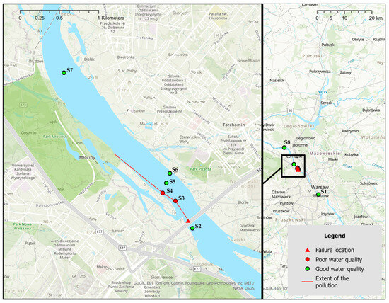 The research was based on monitoring data performed by certified laboratories covering the chemical parameters of the water in the Vistula. Samples for laboratory tests were collected daily into 1-L bottles. The following water quality parameters were analyzed: total nitrogen (TN), ammonium (N-NH4+), nitrite (N-NO2−), nitrate (N-NO3−), total phosphorus (TP), orthophosphates (P-PO43+), suspended solids (SS), total dissolved solids (TDS), pH, electric conductivity (EC), phosphate (SO4), chloride (Cl), total organic carbon (TOC), water temperature (WT), chemical oxygen demand (COD), dissolved oxygen (DO). Value pH, EC, and WT were measured directly in situ and determined using a Multi 340i meter (WTW, Weilheim, Germany). Other chemical parameters of water were measured using the spectrophotometric method with the AQUALYTIC PC Spectro (AQUALYTIC, Langen, Germany) [36]. Samples for water quality analyses in Vistula River were taken during the failure, i.e., from 28 August to 20 October 2020 [35]. Monitoring included daily sampling for water quality testing at 8 stations. Stations S1–2 were located before the point of failure, and stations S3–8 were located after the place of failure (Table 1). The criterion of good ecological status (the standard threshold value) was used to assess the impact of pollutants on the quality of surface waters caused by the discharge of untreated sewage [37]. As surface water is used to supply people, chemical parameters have also been referenced in drinking water quality standards [38,39,40,41]. Threshold values of water quality parameters are presented in Table 2.