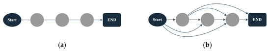 Linear ST (Figure 1a) progresses in a straight line, with a clear beginning, middle, and end. Users experience the narrative along a predetermined path. Traditional films, novels, and plays are examples of this category [10,11]. For example, Age of Sail (2018) is a linear ST case that induces immersion through a clear narrative structure centered on the rescue of the isolated sailor William Avery [22]. Similarly, Doctor Who: The Runaway (2019) unfolds in a straightforward manner; users experience the story by following the given path, accompanying the Doctor on an adventure [22]. However, with only simple visual interactions and a lack of personalized experience, user engagement may be low [12].