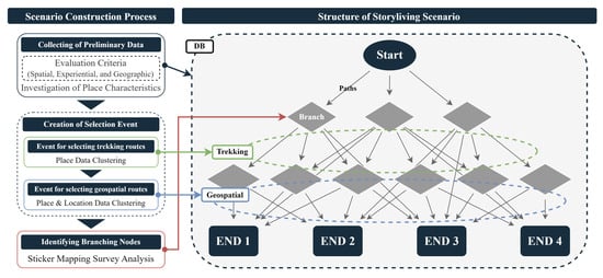 The SL scenario was constructed in a series of steps involving quantitative analysis (Figure 3). First, preliminary data were collected, including spatial, experiential, and geographic characteristics. Clustering was then performed on these data to analyze spatial patterns and design events using trekking and geospatial routes. A sticker-mapping survey identified the spaces most frequently interacted with, and this informed the establishment of branch nodes. All quantitative analyses in this study, including clustering, correlation analysis, and descriptive statistics, were performed using MATLAB. This systematic process allowed the quantitative design of the main routes and the nonlinear scenario.