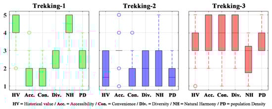 The box plot in Figure 4 shows each characteristic’s median, range, and outliers, revealing the differing patterns of the six characteristics across the clusters [38]. The clustering results reflect the relationships between sense-of-place characteristics in the SL scenario, which will provide users with criteria for making informed choices. The data aid in the establishment of precise trekking route events in the scenario.