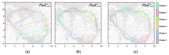 Weights were applied to define geospatial boundaries and prevent cluster overlap [58,59]. This approach can reduce navigation confusion and provide a clear exploration experience. As shown in Figure 5a,b, with a weighting of 1, the clusters were irregular, whereas a weighting of 3 resulted in more regular shapes but some overlap. The weighting of 8 (Figure 5c) produced the most organized and clearly separated clusters and was used further.