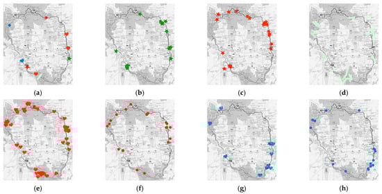To investigate the sense-of-place characteristics of 79 locations along Hanyangdoseong, we used six evaluation criteria, categorized into three types that reflect different dimensions of spatial perception: spatial (historical value [43,44] and accessibility [43,45]), experiential (convenience [45,46] and diversity [45,47,48]), and geographic (natural harmony [44,45,48] and population density [46,47]) (Table 2).