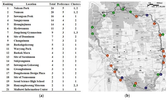 The data were organized by location, resulting in 21 branch nodes. Figure 7a shows the sticker counts and rankings, which represent the total number of stickers placed by participants at each location, and the rankings are based on user preferences. Figure 7b visually presents the preference mapping, highlighting the distribution of preferences along the Hanyangdoseong route. Preferences were ranked using the frequency interval method, and the corresponding sections of each trekking cluster were marked. The branch nodes are located along the Hanyangdoseong route, although some are in spaces not directly related to Hanyangdoseong. These points were interpreted as critical intersections where preferences and aversions overlap, a phenomenon that can be explained by the concepts of place attachment and place aversion [60]. That is, some individuals feel a positive attachment to certain spaces, whereas others feel negative and tend to avoid them.