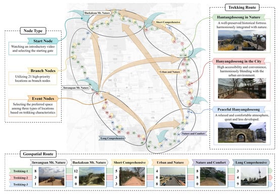 To offer choices to users, we designed the scenario with multiple nodes and types of trekking and geospatial routes (Figure 8).