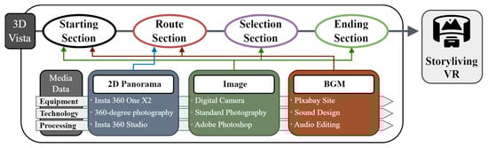 Technical implementation involved multiple data collection and processing steps, organized into the pipeline shown in Figure 9. Two-dimensional panoramas and images were captured using an Insta 360 One X2 (manufactured by Insta360, Los Angeles, CA, USA) and a digital camera, with BGM sourced from Pixabay. The assets were processed using Insta 360 Studio, Adobe Photoshop (Version 25.9), and a sound editor.
