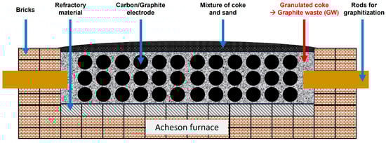 In response to these market pressures, the use of alternative and cost-effective raw materials has emerged as a key strategy [14,15,16,17,18]. One promising approach involves utilizing industrial waste products, particularly graphite waste (GW) [14,15,16,17,18,19,20,21,22]. For instance, insulation material composed of granulated coke used for graphitization in an Acheson furnace (Figure 1), which has been used for over a century for the synthesis of artificial graphite, could be considered a representative example of GW. Due to its existing graphitization, this by-product offers unique potential for reuse, presenting an opportunity to reduce production costs and mitigate environmental impacts. Yet, it is often discarded or underutilized, reflecting a missed opportunity for sustainable material recovery.