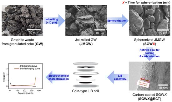 In this study, granulated coke, a waste discarded after the Acheson process—a core process for graphite production—was repurposed as a starting material for LIB anodes. This approach seeks to reduce the production cost of anode materials while simultaneously improving the performance of granulated coke as a viable anode material through further processing. We focus on evaluating the structural and electrochemical characteristics of GW to determine its compatibility with commercial anode materials (CAM). This includes optimizing key parameters such as particle size, SSA, and TD, as well as applying advanced processing techniques such as spheronization and carbon coating to improve its performance [29,30]. The successful adoption of GW for anode production could provide significant economic and environmental benefits, contributing to a more competitive and sustainable battery industry. By reducing reliance on virgin graphite and minimizing the energy-intensive graphitization process, this approach offers a pathway toward more cost-effective and environmentally friendly LIBs.