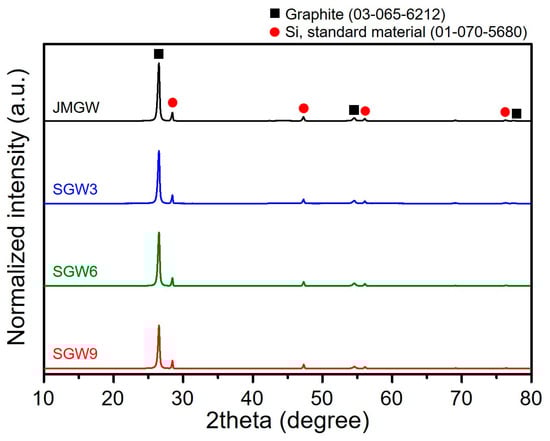 The carbon content was analyzed through proximate analysis (PA) to determine the fixed carbon, volatile matter, and ash content. The analysis was conducted using a TGA701 (LECO, St. Joseph, MI, USA). XRF analysis was performed to determine the elemental composition and carbon purity of the JMGW. The analysis was carried out using a ZSX Primus II (Rigaku, Tokyo, Japan). Calibration was performed using certified standards.