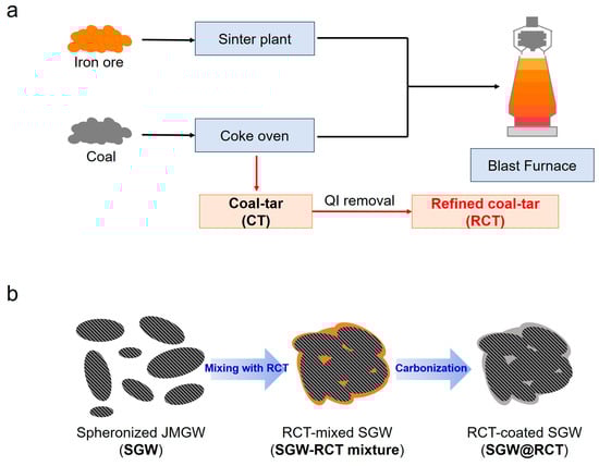 Considering the characteristics of CAM, further improvement in PS, SSA, and TD is required to reach commercially viable levels (Table S4). Therefore, refined coal-tar (RCT), which is coal-tar (CT) with the quinoline insoluble (QI) removed (Table S5), was utilized for the carbon coating and granulation of SGW9 (Figure 5). In other words, to improve the PS, SSA, and TD of SGW9 to a level comparable to commercial products, a method involving mixing with RCT followed by carbonization was employed. Figure 5a shows the manufacturing flow for RCT, while Figure 5b illustrates the carbon coating and granulation processes through RCT coating and carbonization. The RCT-derived carbon-coated SGW9 was labeled as SGW9@RCT.