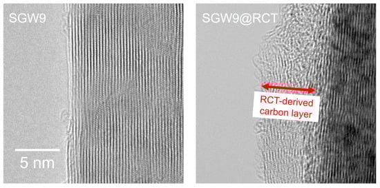 High-resolution TEM was used to examine the carbon coating layer on SGW9@RCT. TEM analysis was conducted using ARM200 (JEOL, Tokyo, Japan). The samples were prepared by dispersing the powder in high-purity ethanol and depositing it onto a copper grid with carbon film.