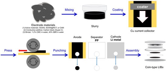 To confirm the electrochemical performance of SGW9, SGW9@RCT, and CAM, we prepared coin-type lithium-ion battery (LIB) cells using SGW9, SGW9@RCT, or CAM as anode materials (Figure 7). For objective comparison, the mass loading and electrode density were controlled (Table S6). The mass loading of the anode materials was controlled within the range of 10.2 to 10.6 mg/cm2, and the electrode density was maintained between 1.53 and 1.55 g/cc.