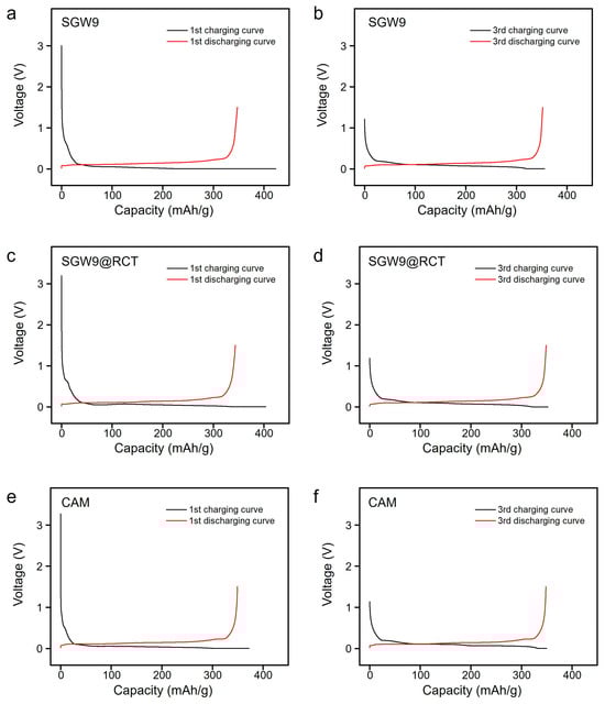 First and third charge–discharge curves of prepared LIB cells: (a,b) SGW9, (c,d) SGW9@RCT, (e,f) CAM.