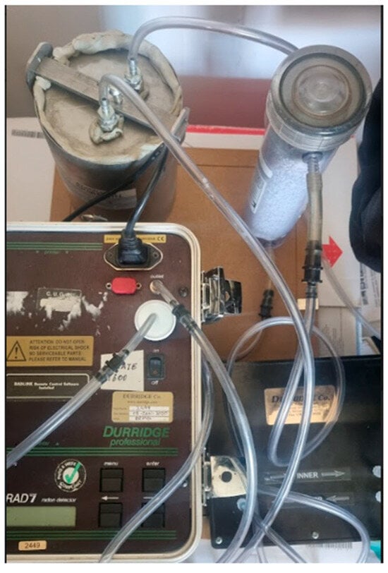 The radon exhalation rate of each aliquot of the analyzed natural stones was assessed by using the Closed Chamber Method (CCM) [26]. In particular, the experimental set-up consists of a small cylindric steel vessel (volume 2.75 L) connected with the Durridge Rad7 instrument [27], a drying unit filled with desiccant (CaSO4), and some vinyl tubes making a closed air circuit (see Figure 1).