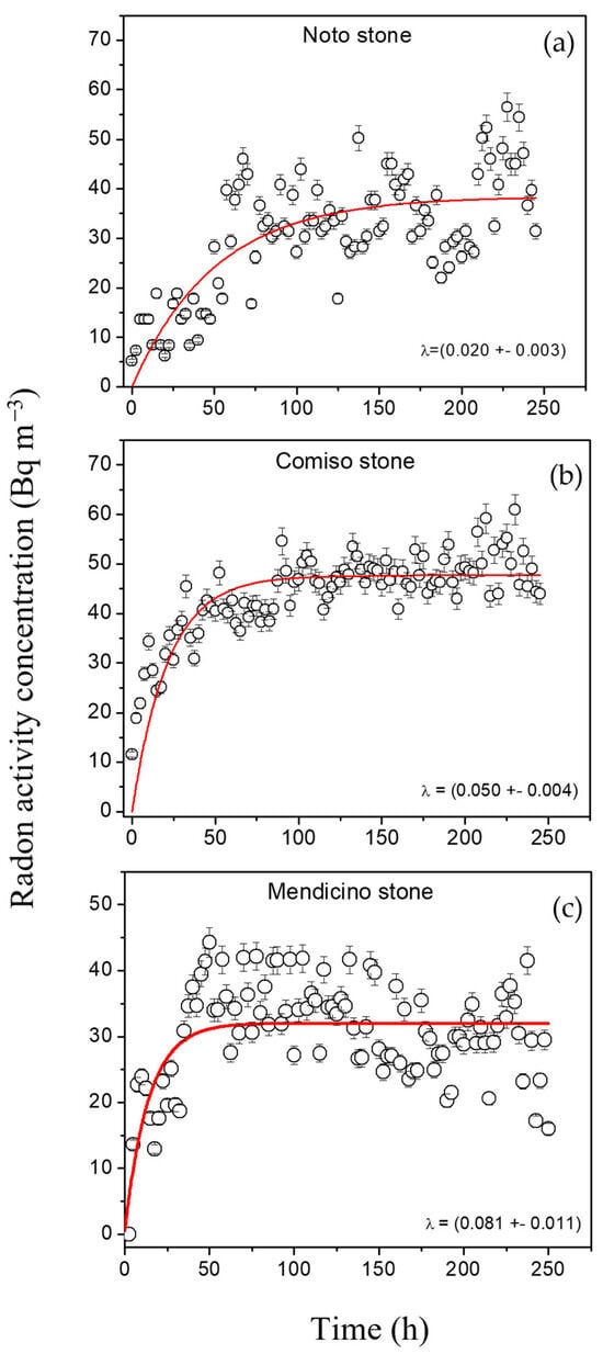The fitted effective decay constant is reported in the graphs. A comparison between its values, i.e., (0.020 ± 0.003) h−1, (0.050 ± 0.003) h−1, and (0.081 ± 0.011) h−1, for the Noto, Comiso, and Mendicino natural stones, respectively, and the radon decay constant, i.e., 0.008 h−1, demonstrate that the bound exhalation and the leakage cannot be neglected as their contribution is equal to about 0.012 h−1, 0.042 h−1, and 0.073 h−1, for the Noto, Comiso, and Mendicino samples, respectively.