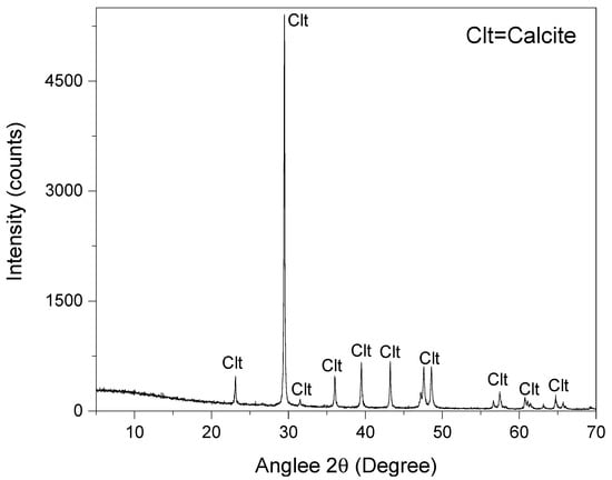 The XRD spectrum reveals clear evidence of a dominant crystalline phase. The labeled peaks, all identified as calcite (Clt), highlight the presence of this mineral as the primary component in the sample. The most intense peak at approximately 29.5° 2θ, corresponding to the main reflection plane of calcite, indicates its high abundance. This condition is typical for calcite-dominated materials, as this peak is associated with the (104) plane, which produces the strongest reflection in calcite due to its crystallographic orientation. In addition, smaller but well-defined peaks are also observed between 20° and 70° 2θ, with characteristic positions confirming calcite as the only significant crystalline phase. These additional peaks further reinforce the conclusion that calcite is the principal mineral, and the uniform intensity and sharpness of these reflections suggest a highly ordered, well-crystallized structure. The lack of any notable peaks or secondary phases suggests that this sample is largely free from impurities, reinforcing the high purity of the calcite in the “Noto” natural stone. The uniformity of the diffraction peaks, coupled with the absence of significant noise, indicates that the sample likely has a homogenous structure without significant mineralogical variation. Thus, the XRD analysis strongly confirms that calcite is the only crystalline mineral present in the sample. The presence of sharp, well-defined peaks and the high intensity of the main calcite reflection identified a high-quality, well-crystallized stone with minimal impurities. The structural uniformity of the “Noto” stone make it more appreciated in architectural and ornamental applications, owing to its mechanical strength and visual appeal [53].