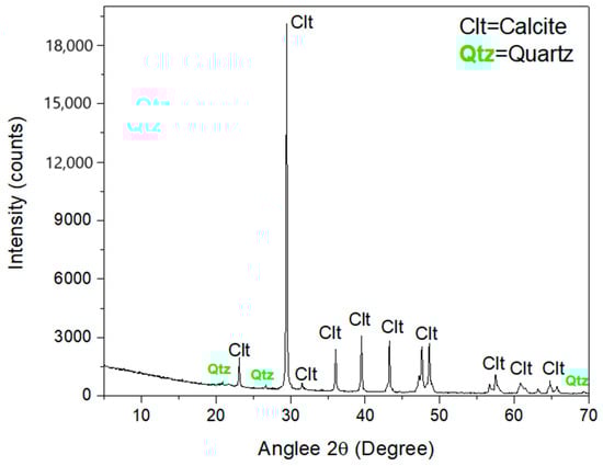 The XRD pattern reveals two primary crystalline phases: calcite (Clt) and quartz (Qtz). Calcite is the predominant mineral, with its strongest diffraction peak occurring around 29.5° 2θ, corresponding to the (104) plane, indicating a high concentration of calcite. Multiple additional calcite peaks between 20° and 70° further confirm its dominance in the sample. The smaller peaks identified at 2θ values around 20.8°, 26.6°, and 68° and the intensity of these reflections indicates that quartz is a secondary phase; however, its identification contributes to the mineralogical composition of the “Comiso” stone. The sharpness of the calcite and quartz peaks indicates a well-crystallized structure, suggesting that the minerals within the sample have undergone minimal weathering or alteration, preserving their crystalline integrity. The combination of calcite and quartz in the sample is coherent with the typical mineralogical composition of limestones, particularly those from the Comiso area, which are often characterized by high calcite content with minor siliceous impurities. This composition enhances the stone’s workability and esthetic appeal, making it highly desirable for architectural uses [54]. The purity of the specimen is notable, as no other significant crystalline phases were detected. This supports the conclusion that the “Comiso” stone is primarily composed of calcite with a small but notable quartz content. Such a composition has been documented in studies focusing on the properties of Comiso limestone, confirming its suitability for both structural and decorative purposes [54]. The XRD analysis confirms that the mineralogical composition of this sample is mainly calcitic, with quartz identified as a secondary phase. The well-crystallized structure and the lack of other mineral phases indicate its high purity, which makes it suitable for a variety of construction and ornamentation applications due to its beneficial mineralogical and mechanical properties [53].