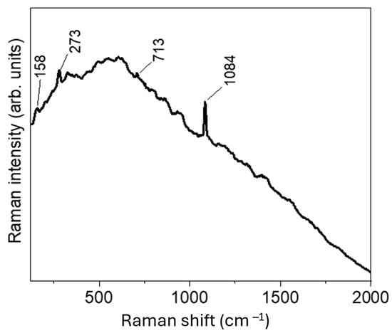 Furthermore, for the “Noto” stone, the detected micro-Raman profile shown in Figure 6 revealed the typical vibrational peaks of calcite (CaCO3), from the observation of a fierce peak at ~1084 cm−1 along with tiny features at ~158 cm−1, ~273 cm−1, and ~713 cm−1, which is related to the normal modes of the most stable polymorph of the calcium carbonate structure. Indeed, the strongest band of the spectrum, centered at ~1084 cm−1, corresponds to the symmetric stretching of the CO3 group, while the Raman peak at ~713 cm−1 can be ascribed to symmetric CO3 deformation and the asymmetric stretching of the carbonate unit, respectively. Moreover, bands at ~158 cm−1 and ~273 cm−1 can be attributed to lattice vibrations involving translations and rotations of the carbonate groups within the crystal [60].