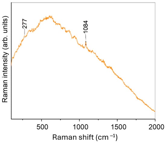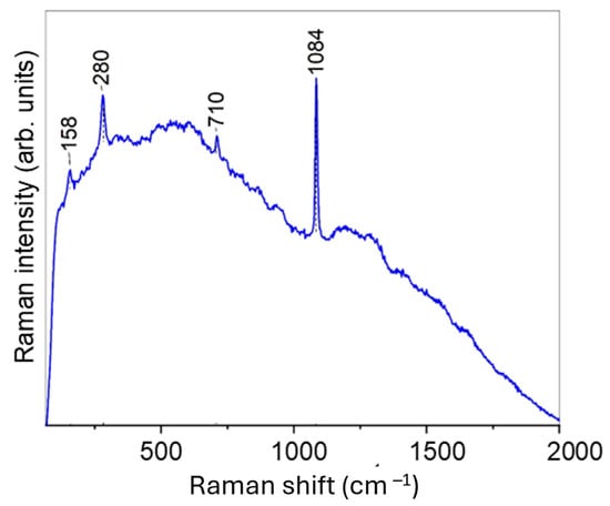 Lastly, the micro-Raman profile of the “Mendicino” stone, shown in Figure 8, suggested a composition also mostly made of calcite, from the observation of a fierce peak at ~1084 cm−1, along with tiny features at ~158 cm−1, ~280 cm−1, and ~710 cm−1 [62].