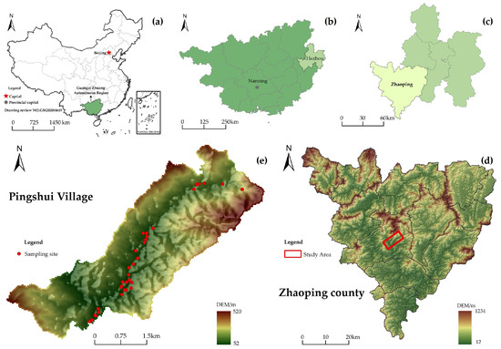 The study area is located in Pingshui Village, Wujiang Town, Zhaoping County, Guangxi, China (Figure 1a–d), in the western part of the Nanling tectonic belt and the central and northern part of the Daya Oshan gold metallogenic belt, mainly exposed to the Cambrian Shuikou Group of strata, including shallow metamorphic sandstone, siltstone, siliceous rock and so on. Fracture structures are developed in the district, including siliciclastic layers, siliciclastic gold-bearing fracture zones and fault-crushing zones. The study area has a subtropical monsoon temperate climate, with high relief in the northeast and low relief in the south, and a hilly landscape in most of the area. The predominant soil type is red soil, characterized by a reddish hue, pronounced acidity, dense texture, abundant aluminum and iron content, as well as high levels of organic matter and nitrogen nutrients. Through field inspections, it was determined that 13.67% of the farmland in the research area had been abandoned, while the remaining land was utilized for cultivating crops such as cassava, corn, tea seed trees, oranges, peanuts, and other economic crops. Approximately 1.5 km upstream from the study area lies the Jinzhu State Gold Mine in Wujiang Town of Zhaoping County; its operations have impacted crop yields in the vicinity and resulted in soil abandonment. Furthermore, there have been significant changes in cultivation practices.