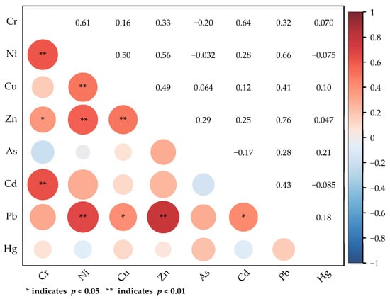 The results of the correlation analysis can reflect the degree of association between different elements and infer their potential homology. The higher the significance of the correlation, the stronger the likelihood that the sources of various heavy metal elements are consistent [29]. The results depicted in Figure 2 demonstrate a significant positive correlation (p < 0.01) among Ni, Cu, Pb, and Zn. Notably, the correlation between Pb and Zn is particularly strong with a coefficient of 0.76, indicating a common or similar source for these four heavy metal elements. There is also a significant correlation between Cr and Ni, Cd and Zn, suggesting that their sources are similar and potentially mixed. The negative or weak correlation (absolute value less than 0.3) observed between As and Hg with other elements implies that As and Hg are unlikely to share the same source as other heavy metals, indicating independent sources for these elements.