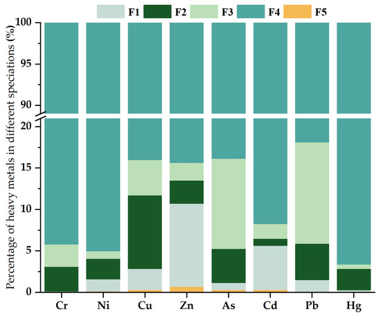 The speciation of various forms of heavy metals in soil and its distribution coefficient (that is, the ratio of the content of various forms of heavy metals to the total amount of heavy metals) is an important index to evaluate the environmental risk of heavy metals [36]. It was demonstrated that heavy metals in the water-soluble fraction and mild acid-soluble fraction easily migrate and transform in the soil, are absorbed by plants, and are more harmful to human beings and the environment; the reducible fraction is the form that is easier for plants to use; the oxidizable fraction is more stable and is the form that is harder to be used by plants, but it will be transformed under alkaline or oxidizing conditions and is potentially hazardous to organisms; and the residual fraction is originated from the soil minerals, which is stable in nature and can exist in the sediment for a long time, is not easy to be absorbed by plants, and is less potentially harmful to the whole soil ecosystem [37]. The distribution characteristics of heavy metal speciation forms in the soil of the study area are illustrated in Figure 3. Generally, there is little variation observed in the distribution characteristics of heavy metal speciation forms within the study area, the main components of Cr, Ni, Cu, Zn, As, Cd, Pb and Hg are all residual fractions. The residual fraction is a form of heavy metal that is not easily affected by changes in the physical and chemical properties of the soil and exists in the soil mainly in the form of layered silicates, which are blocked in the mineral lattice of primary and secondary minerals and are chemically very stable, making it difficult for them to be transported and transformed in the soil medium and have an impact on living organisms [38,39].
