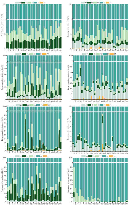 The speciation characteristics of different heavy metals at each sampling point are illustrated in Figure 4. In the study area, Cr predominantly exists in a residual fraction, accounting for an average of over 90%, followed by an oxidizable fraction. This indicates the relatively stable properties of Cr in the study area. The speciation distribution of Ni in the 34 soil sampling sites was more consistent, with a high percentage of residual fraction, higher stability, higher unavailability in the soil, and low risk of contamination. The residual fraction still dominates the speciation form of Cu in the soil at each sampling point in the study area, while the proportion of oxidizable fraction for Cu is significantly higher compared to that of Cr and Ni. This may be due to the fact that the study area belongs to cultivated land, which is richer in organic matter, Cu has a strong affinity for organic matter, and organic matter available for exogenous Cu binding to form the oxidizable fraction is richer, causing it to exist in the form of an oxidizable fraction [40]. The speciation of Zn at the sampling sites is dominated by the residual fraction, followed by the mild acid-soluble fraction. Heavy metals in the mild acid-soluble fraction are mostly adsorbed on the surfaces of clay, humus and other minerals and microorganisms, and are released when environmental conditions such as pH change and can be directly utilized by biological organisms [41]. The pH value of the soil in the study area is in the range of 3.42–5.16, with an average value of 4.02, and the whole is acidic, which makes it easy to accelerate the dissolution and migration of the mild acid-soluble fraction, and there is a certain ecological risk of Zn. Among them, the proportion of mild acid-soluble fraction reached 17.46% and 21.76% in points 3 and 5, which are the two sampling points with the highest proportion of mild acid-soluble fraction in each sampling point in the study area, and they should be paid proper attention. The As in the soil of each sampling point is mainly a residual fraction, and the potential ecological risk to the soil environment is minimal, which is different from the traditional view that gold mining areas easily cause As pollution [42]. Although the proportion of reducible fraction at sampling points 12, 14 and 33 exceeded 20%, and the proportion of oxidizable fraction at sampling points 16 and 33 reached 17.40% and 14.47%, respectively, the proportion of these two forms was far lower than that of residual fraction. Cd mainly exists in the residual fraction, followed by the mild acid-soluble fraction in the soils of the sampling points in the study area, and the proportion of the mild acid-soluble fraction reached 21.29% in the sampling point 19, which needs to be emphasized. In the study of heavy metal pollution in the mining area at home and abroad, Cd pollution widely exists and its biological effectiveness is very high, so further investigation into Cd pollution in our research area is imperative. In domestic and international studies of heavy metal pollution in mining areas, Cd pollution is widespread and highly bio-effective, and in-depth studies of Cd pollution in the study area should be carried out. The speciation of Pb in the soil of each sampling point in the study area was dominated by residual and reducible fractions, and the mild acid-soluble fraction accounted for a relatively small amount, this is due to the large presence of anions such as CO32− and OH in the soil will form ferromanganese oxides with Fe and Mn, which have a strong adsorption capacity of pb2+, and the Pb and the ferromanganese oxides are combined to form a stable complex, which is difficult to be released for migration [41,43]. The water-soluble fraction of Hg is not detected in all sampling sites in the study area, and the mild acid-soluble fraction of Hg is not detected in some of the sampling sites, and the main storage form was the residual fraction. Sampling site No.1 is different from the other sites in that the oxidizable fraction accounted for a higher percentage of the total, but the soil in the study area is acidic, and the oxidizable fraction is more stable, so the ecological hazards are lower.