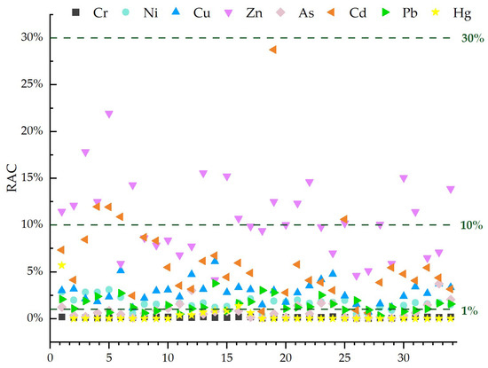 The risk assessment code method (RAC) [23] is a classical quantitative evaluation method to classify the degree of bioavailability and its risk to the environment based on the strength of the binding of heavy metals to the soil and the ability of heavy metals to be released from the soil and enter into the food chain, which quantifies the ecological risk of heavy metals by calculating the proportion of the active form of heavy metals (water-soluble fraction + mild acid-soluble fraction) in the total amount, and the higher the proportion, the greater the risk to the environment [24]. The formulae were as follows: