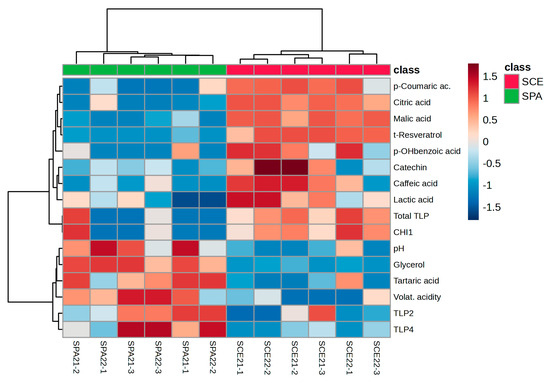 Using the first dataset, clear clustering of wines according to yeast species was achieved, as illustrated in the heatmap in Figure 1. The control SCE wines from both harvest years showed higher levels of organic acids, including malic acid, as well as several phenols, particularly p-coumaric acid and trans-resveratrol. These wines also had elevated levels of specific PR proteins, notably a group of chitinases. SPA wines were consistent in having higher levels of pH, glycerol, tartaric acid, volatile acidity, and particular thaumatin-like PR proteins, compared to control SCE wines.