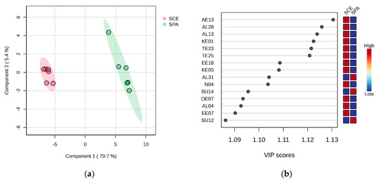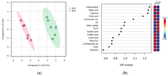 (a) Differentiation of Malvazija istarska wines produced by fermentation with Saccharomyces cerevisiae (SCE) and Saccharomyces paradoxus (SPA) yeasts in two harvest years according to yeast species in two-dimensional space by partial least squares−discriminant analysis (PLS−DA); (b) variable importance in projection (VIP) scores highlighting the most influential variables (physico-chemical parameters, PR proteins, grape-derived phenolic compounds; normalized data) contributing to the differentiation.