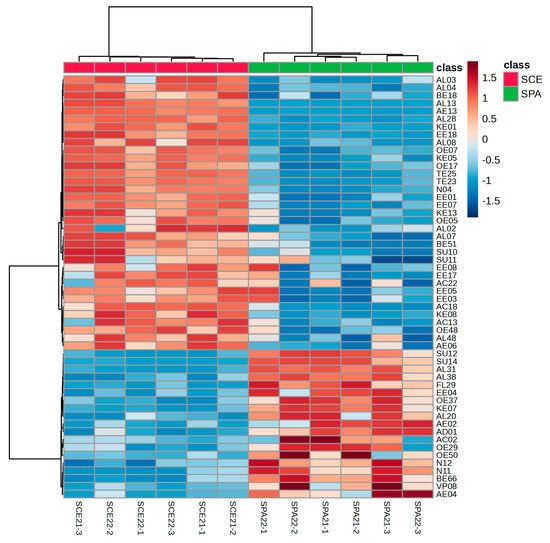Hierarchical clustering analysis of Malvazija istarska wines produced by fermentation with Saccharomyces cerevisiae (SCE) and Saccharomyces paradoxus (SPA) yeasts in two harvest years (2021, 2022) based on the composition of selected volatile compounds determined by GC/FID, GC/MS, and GC × GC/TOF-MS analysis. Each row of the heatmap represents a specific parameter or a compound, while columns denote individual samples. Cell colours indicate compound abundance (normalized data): dark blue signifies low abundance, pale colours reflect medium abundance, and dark red denotes high abundance. Compounds’ codes correspond to those in Table 4, Table 5, Table 6, Table 7, Table 8, Table 9, Table 10, Table 11, Table 12, Table 13, Table 14, Table 15, Table 16 and Table 17.
