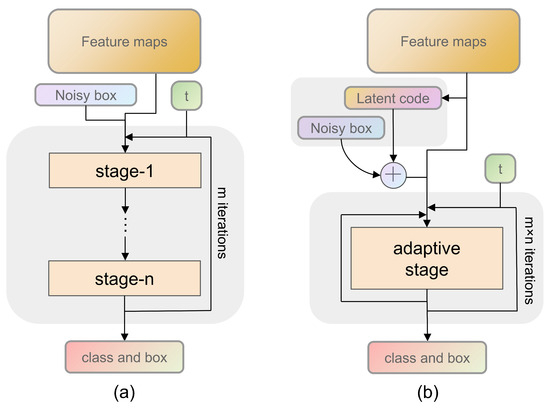In early deep learning-based object detection methods [10,11,12], dense anchor boxes, often manually designed, were extensively employed to generate region proposals [13]. These anchor boxes, predefined at different scales and aspect ratios, enabled the network to predict bounding boxes for potential objects. This anchor-based approach, while effective, had inherent limitations, such as increased computational complexity and the need for the careful tuning of anchor configurations to achieve optimal performance. To address these issues, more efficient approaches have emerged, including anchor-free methods [14,15,16,17], object queries [18,19,20,21,22], learnable proposals [23], and more recently, the noise-to-box approach introduced in DiffusionDet [24].