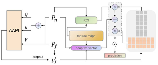 We simplify the representation of the adaptive denoising process as . Here, proposal feature serves as a key intermediate variable, receiving positional information and noise from while also transmitting bounding box offsets through . This dual role highlights ’s critical importance in both capturing and transmitting target information. Therefore, we improved two proposal interaction modules (corresponding to self-attention and dynamic convolution) for manipulating pf by introducing AAPI and ACPI. These two submodules together form what we call adaptive interaction, which directly corresponds to the adaptive stage in Figure 1b and a single decoder layer in the adaptive denoising process. We represent the adaptive interaction (the pipeline of a single iteration in the adaptive denoising process) using Equations (7)–(9).