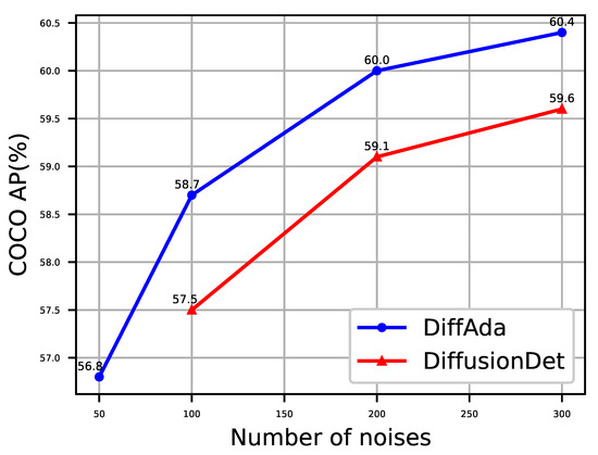 Comparison of DiffusionDet and DifAda using a different number of noises.
