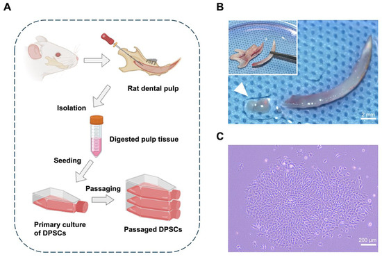 Establishment of primary and senescent dental pulp stem cells (DPSCs) from 5-week-old male Wistar/ST rats. (A) Schematic showing preparation of primary and senescent DPSCs. (B) Macroscopic images of rat mandibular incisor and pulp (arrowhead). (C) Microscopic observation of DSPCs passaged 0 times.