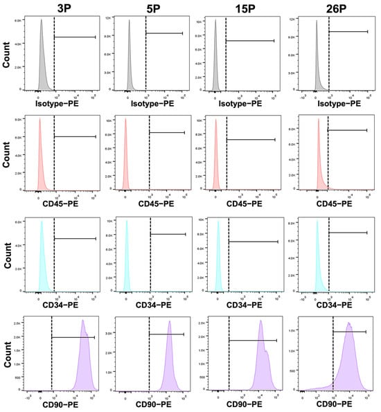Expression patterns of surface antigens on rat DPSCs after passaging. Flow cytometric analysis used to detect surface antigens: CD34 for hematopoietic stem cells and endothelial cells marker, CD45 as leucocyte marker, and CD90 for mesenchymal stem cell marker. 3P, 5P, 15P, and 26P indicate 3, 5, 15, and 26 passages.
