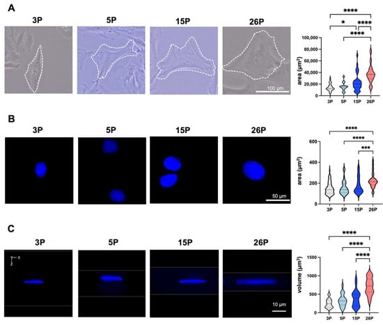 Changes in rat DPSC shapes and nuclei morphologies. Microscopic observations of cell shapes (A) and nuclei (B) after 3, 5, 15, and 26 passages (3P, 5P, 15P, and 26P, respectively) and their semi-quantified data (n = 50, violin plot) on cell and nuclear size. (C) Orthogonal views (X–Z planes) from three-dimensional reconstruction images on nuclei and quantitative data of those volumes (n = 20, violin plot). * p < 0.05, *** p < 0.001, and **** p < 0.0001.