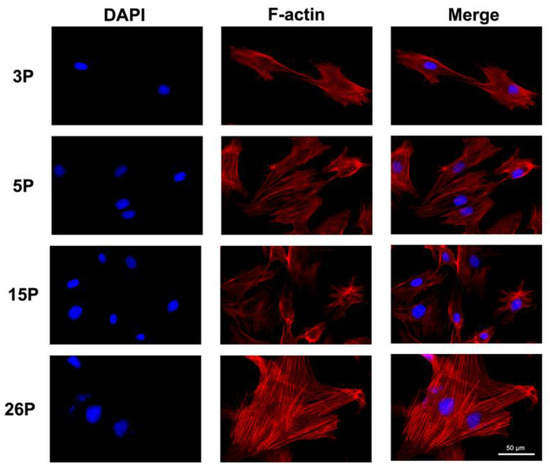 FACS analysis was conducted to verify the surface antigens of the DPSCs using CD29, CD34, CD44, CD45, and CD90 antibodies. At 3P, CD34 (recognized as the endothelial and hematopoietic cell marker) and CD45 (as a leucocyte marker) were minimally expressed in the cell population, whereas CD29, CD44, and CD90, which are widely expressed in DPSCs [12,14], were expressed in these cells (Figure 2 and Figure S2 and Table 1). A modest reduction in the proportion of CD90-positive cells was observed after 26P (Figure 2 and Table 1). The cell and nucleus areas and nuclear volume of DPSCs increased with the increasing number of passages (Figure 3). As is consistent with the previous study conducted by other researchers utilizing fibroblast (WI-38 cells) [38], an increase in the number of stress fibers was observed in the senescent DPSCs (26P) (Figure 4).