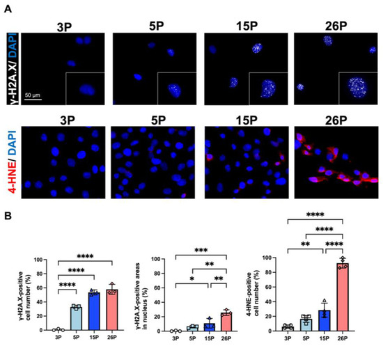 Replicative senescence can cause DNA damage and increase cellular endogenous ROS production [39,40]. A high number of passages potentially affect DNA damage and intracellular ROS production in rat DPSCs. γ-H2A.X foci-positive cells increased with the increasing numbers of passages, especially after 5P (Figure 5). The increase in the γ-H2A.X foci area relative to the nucleus was minimal after 5P and significantly increased after 26P (Figure 5). Intracellular ROS can promote DNA damage and the cellular senescence of stem cells [40]. The number of 4-HNE-positive cells significantly increased with the increasing number of passages (Figure 5). A significant increase in cells was observed after 26P despite the abundance of cells with DNA-damage after 5P. These results indicate that DNA damage in DPSCs at early and mid-passages (5P and 15P) is not associated with intracellular ROS, whereas intracellular ROS likely exacerbates DNA damage in subsequent passages.