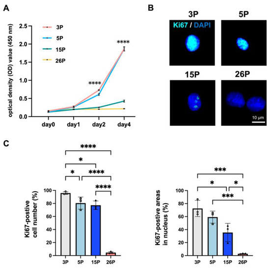 Proliferation profiles of DPSCs. (A) Cell Counting Kit-8 (CCK-8) assays. Comparison of proliferation between 15P and 26P with 3P and 5P. Two-way ANOVA with Tukey’s test; n = 5. (B) Immunofluorescence staining of Ki67 in DPSCs and (C) their semi-quantified data. Data presented as mean with SD. * p < 0.05, *** p < 0.001, **** p < 0.0001; one-way ANOVA with Tukey’s test. (n = 3; each data point represents percentage of positive cells (or area) calculated by counting positive cells (or area) per 50 cells (or nuclei) in random areas).