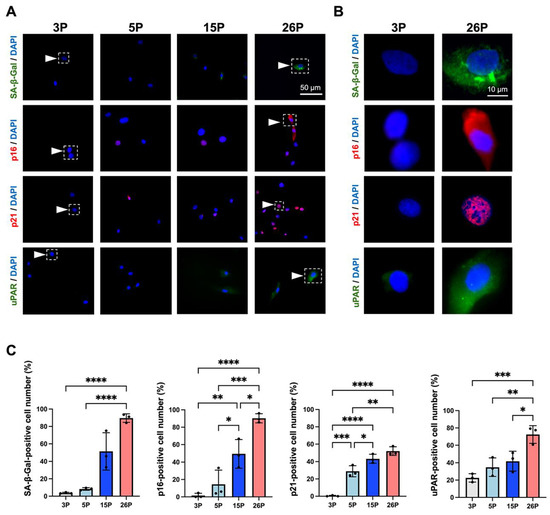 Expression of cellular senescence markers. Immunofluorescence staining of four senescence markers for DPSCs at low (A) and high (B) magnifications. Arrowheads: magnified cells for (B). (C) Semi-quantified data from panels A and B. Data presented as mean with SD. * p < 0.05, ** p < 0.01, *** p < 0.001, and **** p < 0.0001; one-way ANOVA with Tukey’s test. (n = 3; each data point represents percentage of positive cells calculated by counting positive cells per 50 cells in random areas).