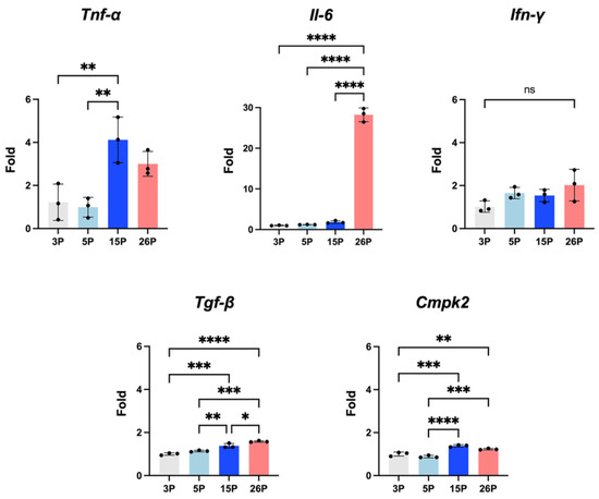 The genes involved in senescence-related molecules in each passaged cell were identified using qRT-PCR (Figure 8). A significant increase in the expression of proinflammatory cytokines Tnf-α and Il-6, known as SASP factors, was observed at 15P or 26P, whereas growth factor Tgf-β exhibited a slight increase after 15P. However, no obvious statistically significant difference was observed for Ifn-γ from 3P to 26P. Although there was statistical significance, no remarkable increase was detected in the Cmpk2.