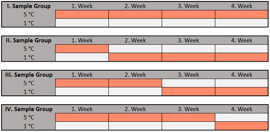 There were four sample groups at the experimental design. During the aging process, the different sample groups spent different durations in refrigeration units set at 5 °C and 1 °C, respectively. The temporal combination of these temperature parameters is illustrated in Figure 1. Samples were measured from each sample group each week during the aging experiment, resulting in five measurement days: week 0 (control), week 1, week 2, week 3, and week 4. Therefore, the longest aging period was 28 days.