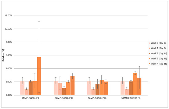 Drip loss results [%] of sample groups (I., II., III., IV.) at each measurement day (0, 7, 14, 21, 28).
