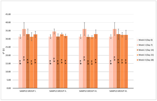 Lightness (L*) [-] results of different sample groups (I., II., III., IV.) at each measurement day (0, 7, 14, 21, 28) (lowercase Latin letters indicate significant differences according to sample groups and uppercase Latin letters indicate significant differences according to storage time).