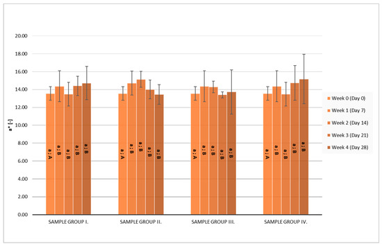 Redness–greenness (a*) [-] results of different sample groups (I., II., III., IV.) at each measurement day (0, 7, 14, 21, 28) (lowercase Latin letters indicate significant differences according to sample groups and uppercase Latin letters indicate significant differences according to storage time).