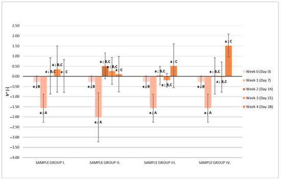 Yellowness–blueness (b*) [-] results of different sample groups (I., II., III., IV.) at each measurement day (0, 7, 14, 21, 28) (lowercase Latin letters indicate significant differences according to sample groups and uppercase Latin letters indicate significant differences according to storage time).