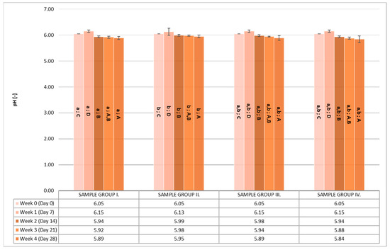 pH [-] results of different sample groups (I., II., III., IV.) at each measurement day (0, 7, 14, 21, 28) (lowercase Latin letters indicate significant differences according to sample groups and uppercase Latin letters indicate significant differences according to storage time).