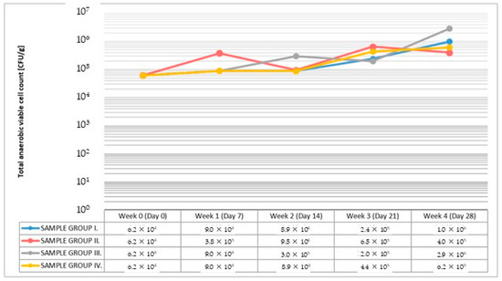 Total anaerobic viable cell count [CFU/g] results of different sample groups (I., II., III., IV.) at each measurement day (0, 7, 14, 21, 28).